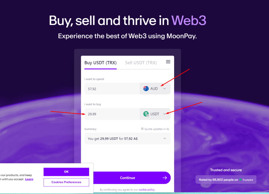 2. Select your currency in sending currency and USDT(TRC-20) in the receiving currency. Put 29.99 in "I want to buy" field